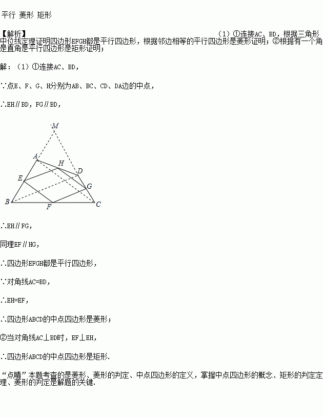 四边形ABCD中,点E、F、G、H分别为AB、BC、CD、DA边的中点,顺次连接各边中点得到的新四边形EFGH称为中点四边形;画图猜想:无论四边形ABCD怎样变化,它的中点四边形EFGH都是_____四边形。当满足以下条件时;