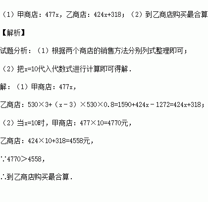 (2015秋•甘谷县期末)某种铂金饰品在甲、乙两种商店销售,甲店标价每克477元,按标价出售,不优惠.乙店标价每克530元,但若买的铂金饰品重量超过3克,则超出部分可打八折出售.若购买的铂金饰品重量为x克,其中x>3.
