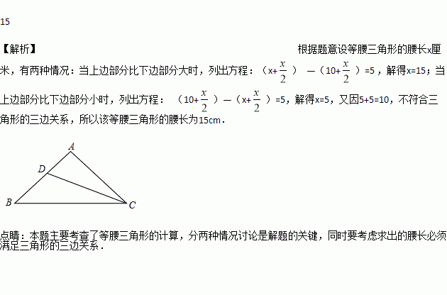 已知等腰三角形的底边长为10cm,一腰上的中线把三角形的周长分为两部分,其中一部分比另一部分长5cm,那么这个三角形的腰长为 ______ cm.