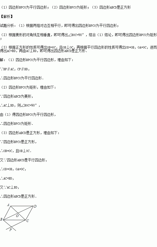 (2)若将平行四边形ABCD改为菱形ABCD,其他条件不变,得到的四边形BPCO是什么四边形,并说明理由;