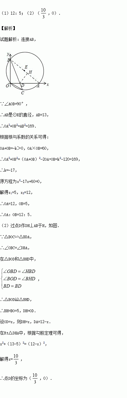 如图,直径为13的圆M,经过原点O,并且与x轴、y轴分别交于A、B两点,线段OA、OB(OA>OB)的长分别是方程