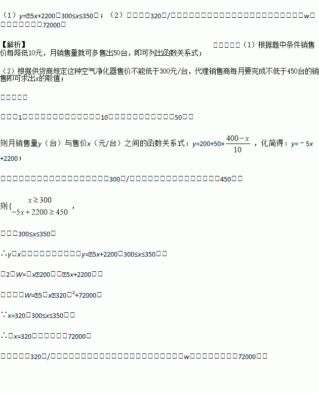 我国中东部地区雾霾天气趋于严重,环境治理已刻不容缓.我市某电器商场根据民众健康需要,代理销售某种家用空气净化器,其进价是200元/台.经过市场销售后发现:在一个月内,当售价是400元/台时,可售出200台,且售价每降低10元,就可多售出50台.若供货商规定这种空气净化器售价不能低于300元/台,代理销售商每月要完成不低于450台的销售任务.