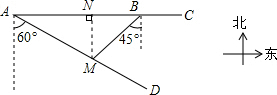 分析 根据题意,在△ABM中,∠BAM=30°,∠ABM=45°,AB=6米.过点M作MN⊥AB于N,设MN=x米,用含x的代数式分别表示AN,BN,根据AN+BN=AB建立方程,解方程求出x的值,进而求出MA与MB的长.