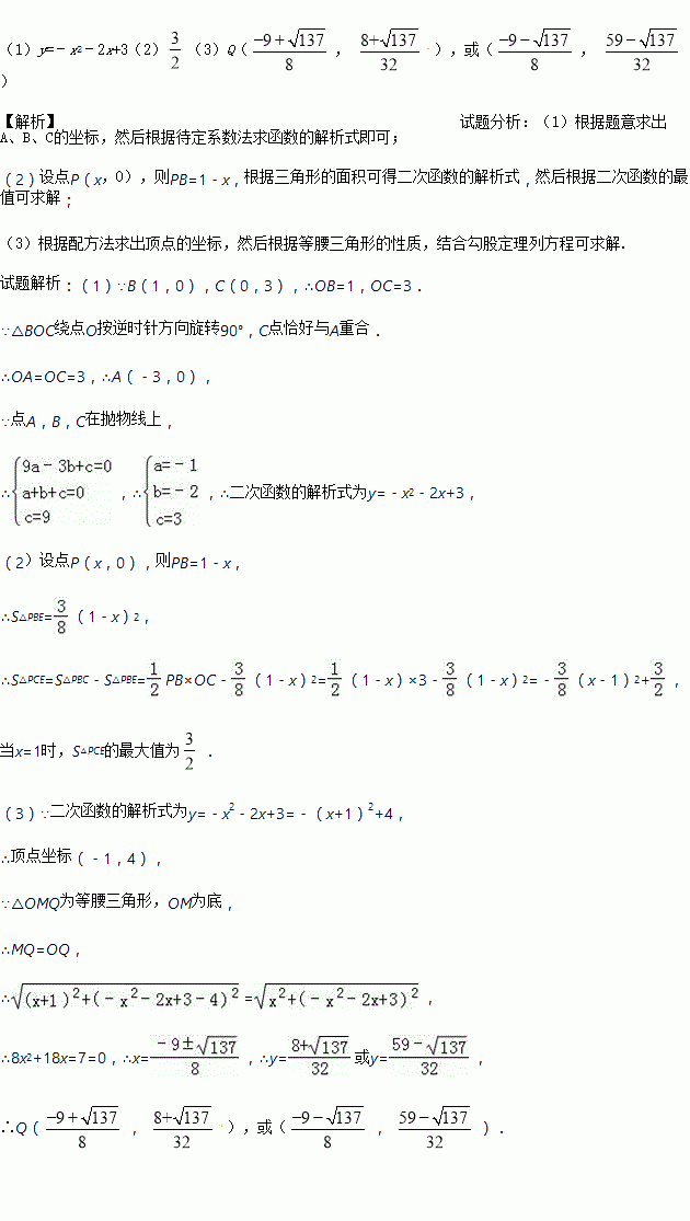 如图,二次函数y=ax2+bx+c的图象交x轴于A、B两点,交y轴于点C,且B(1,0),C(0,3),将△BOC绕点O按逆时针方向旋转90°,C点恰好与A重合.