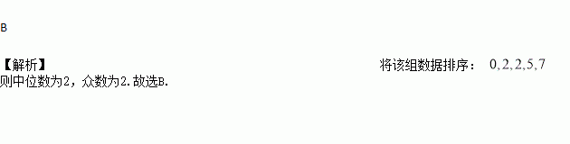 某部队一位新兵进行射击训练,连续射靶5次,命中的环数分别是0,2,5,2,7.这组数据的中位数与众数分别是( )