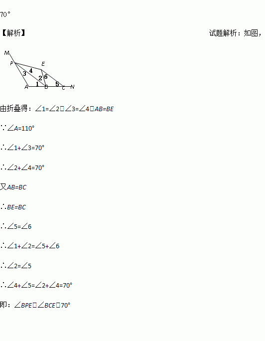 如图,∠A=110°,在边AN上取B,C,使AB=BC.点P为边AM上一点,将△APB沿PB折叠,使点A落在角内点E处,连接CE,则∠BPE+∠BCE=__________°.