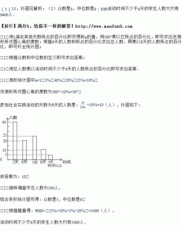 (3)如果该区共有七年级学生约9000人,请你估计活动时间不少于6天的学生人数大约有多少?