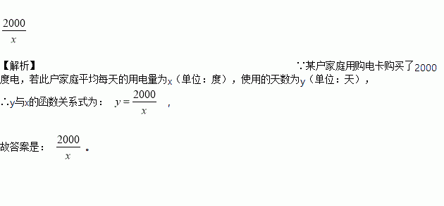 某户家庭用购电卡购买了2 000度电,若此户家庭平均每天的用电量为x(单位:度),这2 000度电能够使用的天数为y(单位:天),则y与x的函数关系式为y=__________.