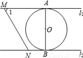 如图,直线l1∥l2,⊙O与l1和l2分别相切于点A和点B.直线MN与l1相交于M;与l2相交于N,⊙O的半径为1,∠1=60°,直线MN从如图位置向右平移,下列结论