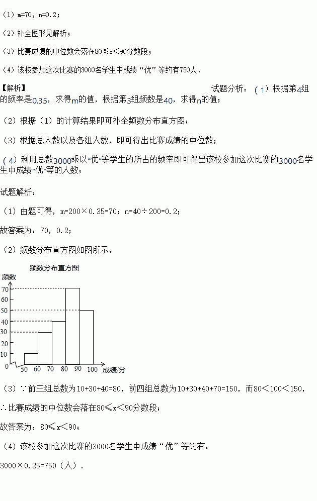 (4)若成绩在90分以上(包括90分)的为“优”等,则该校参加这次比赛的3000名学生中成绩“优”等约有多少人?