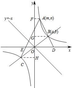 (2)分两种情况讨论:由双曲线的对称性可知,C(-a,-b),①当点A在直线BC的上方时,过A、B、C分别作y轴的垂线,垂足分别为F、G、H,则OF=n,OG=OH=b,得出FG=OF-OG=n-b,FH=OF+OH=n+b,由平行线得出比例式,即可得出结论;