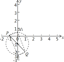 如图,以P(-1,0)和Q(1,-2)之间的线段为直径画弧,交y轴于M1、M2,则OM1最小,OM2最大,![]()