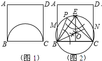 (2)①以BC为边在正方形内作等边△BCE;②作△BCE的外接圆⊙O,分别与AB、DC交于点M、N,由于在⊙O中,弧$\widehat{BC}$的圆周角均为60°,所以$\widehat{MN}$上的所有点均为所求的点P.
