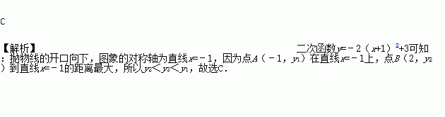 已知A(-1,y1)、B(2,y2)、C(-3,y3)在函数y=-2(x+1)2+3的图像上,则y1、y2、y3的大小关系是
