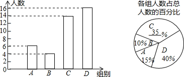 D的人数为40×40%=16(人),C占的百分比为1-(10%+15%+40%)=35%,