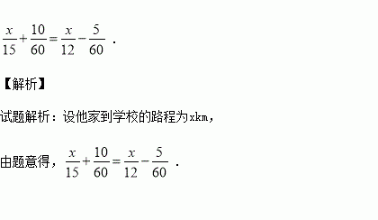 小明从家里骑自行车到学校,每小时骑15km,可早到10min;每小时骑12km,就会迟到5min.问他家到学校的路程是多少千米?设他家到学校的路程为xkm,则根据题意列出的方程是 .