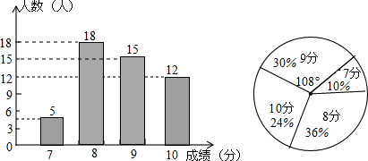 ∴跳绳成绩能得9分的人数为$\frac{108}{360}$×50=15(人);跳绳成绩能得8分的人数为50-(5+12+15)=18(人),