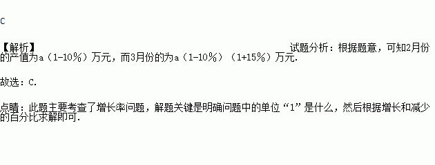 池州某企业今年1月份产值为a万元,2月份比1月份减少了10%,预计3月份比2月份增加15%.则3月份的产值将达到( )