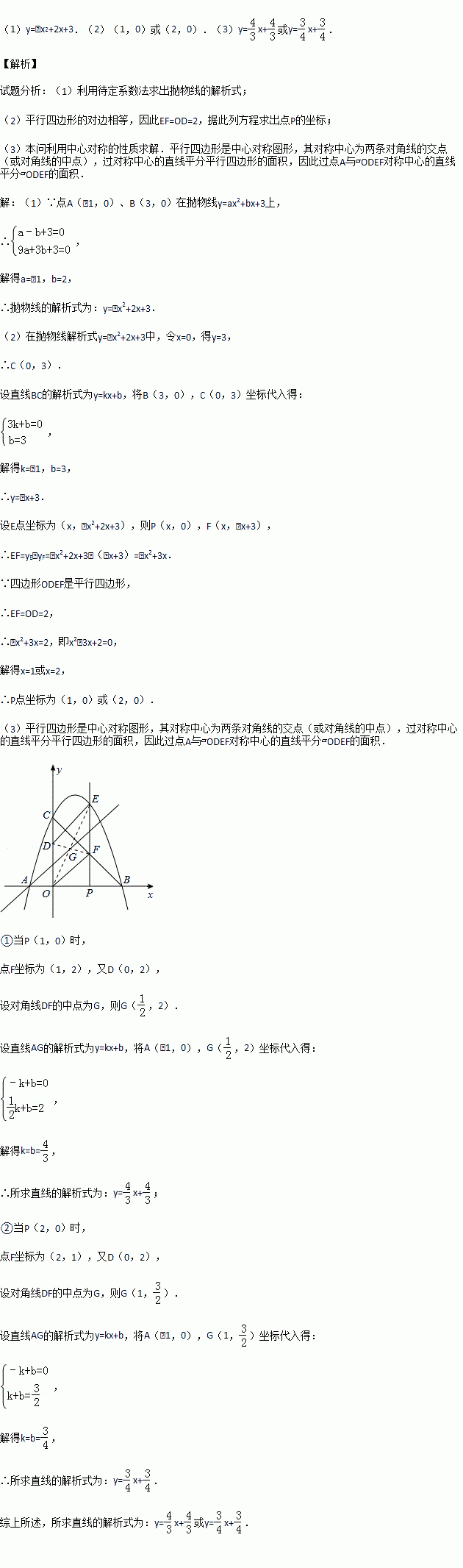 (3)过点A的直线将(2)中的平行四边形ODEF分成面积相等的两部分,求这条直线的解析式.(不必说明平分平行四边形面积的理由)