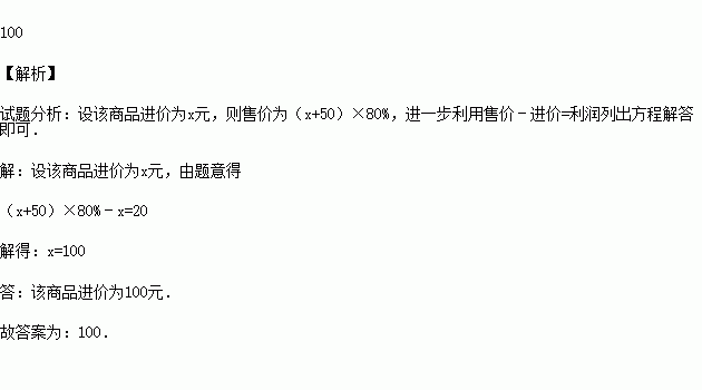 (2015秋•浦口区校级期末)某商店在进价的基础上提高50元作零售价销售,商店又以8折(即售价的80%)的价格开展促销活动,这时一件商品所获利润为20元,则该商品进价为 元.