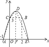 ∴A点坐标为(-1,0),C点坐标为(0,3),D点坐标为(1,4)、E点坐标为(3,0),