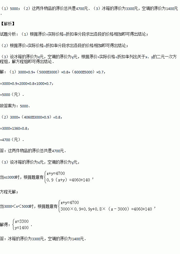 (2)已知张老师购买了两件物品(一个冰箱和一个空调)共付费4060元.请问这两件物品的原价总共是多少元?