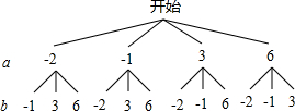 分析 首先根据题意画出树状图,然后由树状图求得所有等可能的结果与点(a,b)恰好在反比例函数y=-$\frac{6}{x}$的图象上的情况,再利用概率公式即可求得答案.