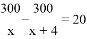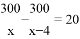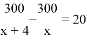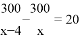 五一”期间,某班同学包租一辆面包车前去东方太阳城游览,面包车的租金为300元,出发时,又增加了4名同学,且租金不变,这样每个同学比原来少分摊了20元车费,若设原来参加游览的同学有x人,为求x,可列方程为( )