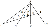 分析 作DM∥BC交AE于M,交AF于N,如图,根据平行线分线段成比例定理,由DN∥CF得$\frac{DN}{CF}$=$\frac{AD}{AC}$=$\frac{1}{2}$,由DN∥BF得$\frac{DH}{BH}$=$\frac{DN}{BF}$,于是有$\frac{DN}{2CF}$=$\frac{z}{x+y}$=$\frac{1}{4}$,则x+y=4z,同样方法可得x=y+z,然后解方程组得到x=$\frac{5}{2}$z,y=$\frac{3}{2}$z,