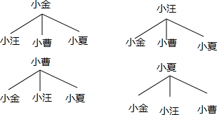 解答 解:(1)若已确定小金打第一场,再从其余三位同学中随机选取一位,求恰好选中小汪同学的概率=$\frac{1}{3}$;