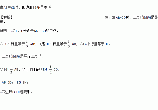 如图,在四边形ABCD中,点E,F分别是AD,BC的中点,G,H分别是BD,AC的中点,AB,CD满足什么条件时,四边形EGFH是菱形?请证明你的结论.