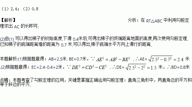 (2)如果梯子的顶端A沿墙下滑0.4米(即AC=0.4米),则梯脚B将外移(即BD长)多少米