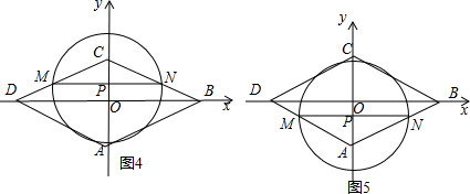 (3)分类讨论由(1)知,△APM∽△ADO,得到PM=2PA=2x,证得CE=AP=x,根据PC的长度列方程$\sqrt{5}$x=2-x,解得x=$\frac{\sqrt{5}-1}{2}$,于是当$0<x<\frac{{\sqrt{5}-1}}{2}$时,以MN为直径的圆与CD、B两边(包括端点)的公共点有0个 当 $x=\frac{{\sqrt{5}-1}}{2}$时,有2个,如图3,当⊙P过点C时,根据PC=PM列方程2-x=2x,解得x=$\frac{3}{2}$,于是得到当x=$\frac{2}{3}$时,以MN为直径的圆与CD、CB两边(包括端点)的公共点有3个,如图4,当$\frac{2}{3}<x<2$时,以MN为直径的圆与CD、CB两边(包括端点)的公共点有2个,如图5,当$\frac{\sqrt{5}-1}{2}$<x<$\frac{2}{3}$ 时,以MN为直径的圆与CD、CB两边(包括端点)的公共点有4个.