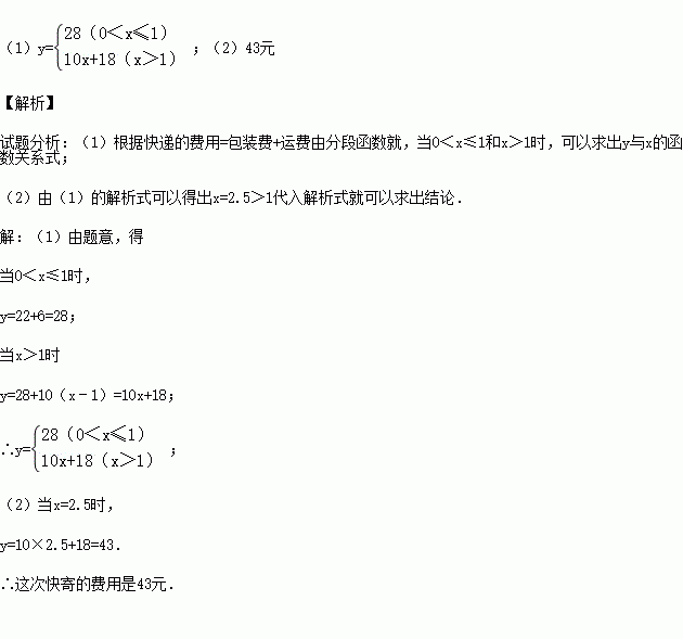 (2014•陕西)小李从西安通过某快递公司给在南昌的外婆寄一盒樱桃,快递时,他了解到这个公司除收取每次6元的包装费外,樱桃不超过1kg收费22元,超过1kg,则超出部分按每千克10元加收费用.设该公司从西安到南昌快递樱桃的费用为y(元),所寄樱桃为x(kg).