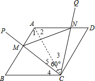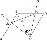 分析:(1)利用菱形的性质首先得出△ABC是等边三角形,进而得出△ANC≌△BMC,即可得出△CMN是等边三角形;
