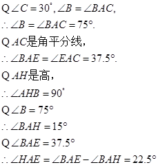 如图,AE、AH分别为△ABC的角平分线和高,∠B=∠BAC,∠C=30°,求∠BAE、∠HAE的度数.![]()