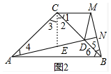 £¨2£©¹ýµãC×÷CEƽ·Ö¡ÏACB£¬½»ADÓÚµãE£®ÓÉ¡÷ACE¡Õ¡÷BCM£¨ASA£©£¬ÍƳöCE=CM£¬ÓÖÒòΪ¡Ï1=¡Ï2£¬CD=CD£¬ÍƳö¡ÏCDE=¡ÏCDM£¬ÓÉ¡ÏBDN=¡ÏCDE£¬¡ÏMDN+¡ÏCDE+¡ÏCDM=180¡ã£¬¼´¿ÉÖ¤Ã÷£®