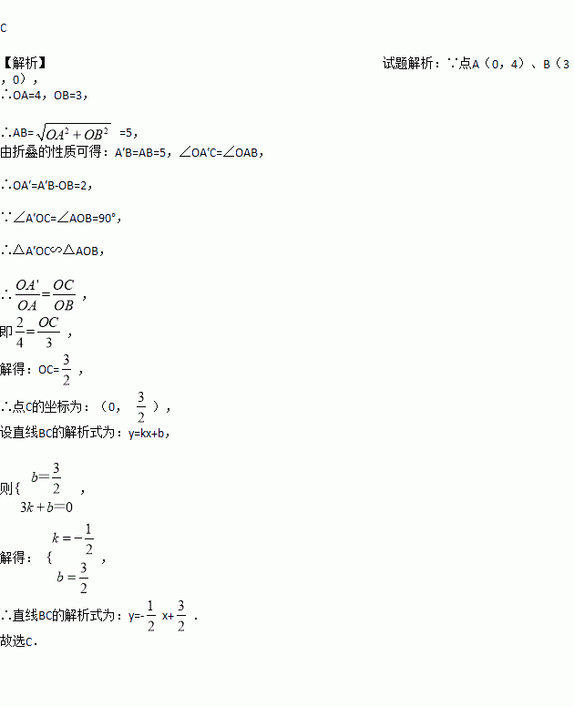 如图,在平面直角坐标系中,点A(0,4)、B(3,0),连接AB,将△AOB沿过点B的直线折叠,使点A落在x轴上的点A′处,折痕所在的直线交y轴正半轴于点C,则直线BC的解析式为( )