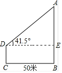 在Rt△ADE中,AE=DE•tan41.5°≈50×0.885≈44.25(米),