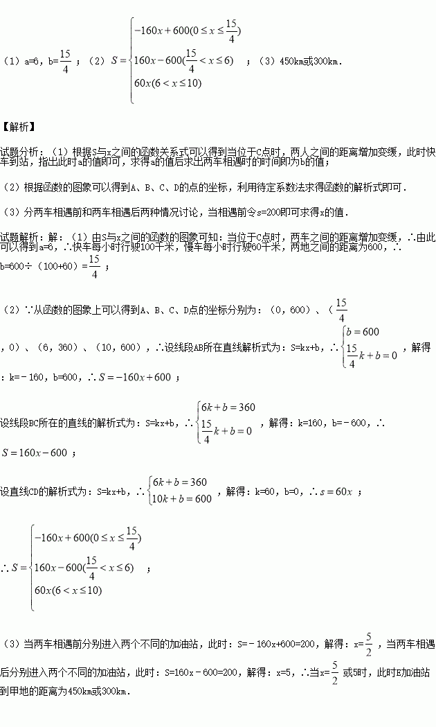 (km),慢车行驶时间为x(h),两车之间的距离为S(km),