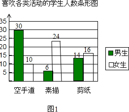 分析 (1)根据空手道女生所占的百分比计算出女生总人数,即可求出素描的女生人数,即可补全条形图;