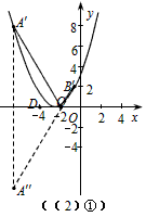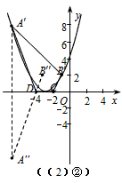 | (2)① A′C+CB′最短,此时抛物线的函数解析式为 ②左右平移抛物线 第一种情况:如果将抛物线向右平移,显然有A′D+CB′>AD+CB,因此不存在某个位置,使四边形A′B′CD的周长最短; 第二种情况:设抛物线向左平移了b个单位,则点A′和点B′的坐标分别为A′(-4-b,8)和B′(2-b,2),因为CD=2,因此将点B′向左平移2个单位得B′′(-b,2),要使A′D+CB′最短,只要使A′D+DB′′最短, 点A′关于x轴对称点的坐标为A′′(-4-b,-8),直线A′′B′′的解析式为 |