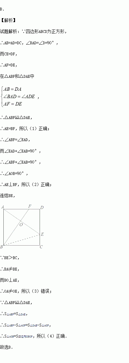 如图,E、F分别是正方形ABCD的边CD、AD上的点,且CE=DF,AE、BF相交于点O,下列结论:(1)AE=BF;(2)AE⊥BF;(3)AO=OE;(4)S△AOB=S四边形DEOF中正确的有( )