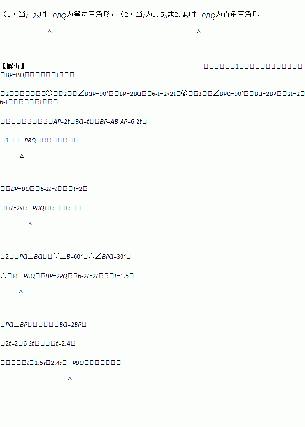 已知:如图所示,△ABC是边长6cm等边三角形,动点P、Q同时从A、B两点出发,分别在AB、BC边上均速移动,它们的速度分别为Vp=2cm/s,VQ=1cm/s,当点P到达点B时,P、Q两点停止运动,设点P的运动时间为t s