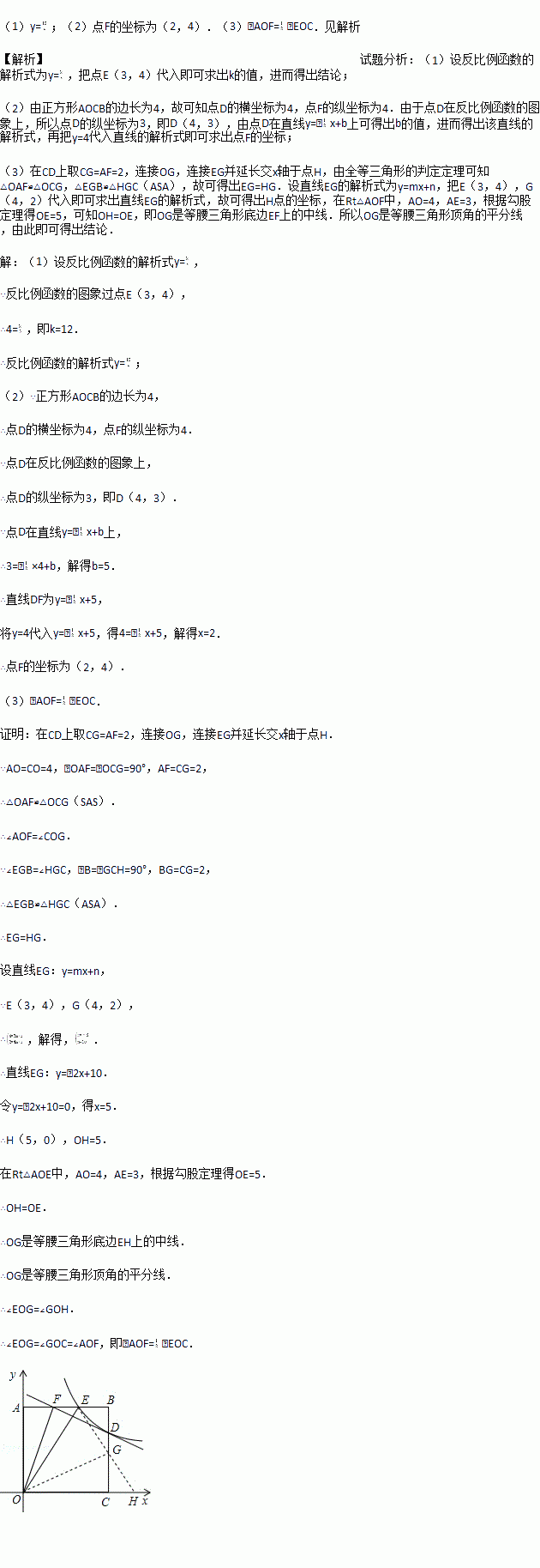 如图,正方形AOCB的边长为4,反比例函数的图象过点E(3,4).