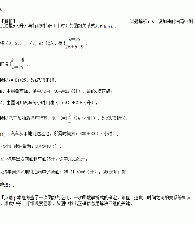 张师傅驾车从甲地到乙地,两地相距500千米,汽车出发前油箱有油25升,途中加油若干升,加油前、后汽车都以100千米/时的速度匀速行驶,已知油箱中剩余油量y(升)与行驶时间t(时)之间的关系如图所示.以下说法错误的是( )