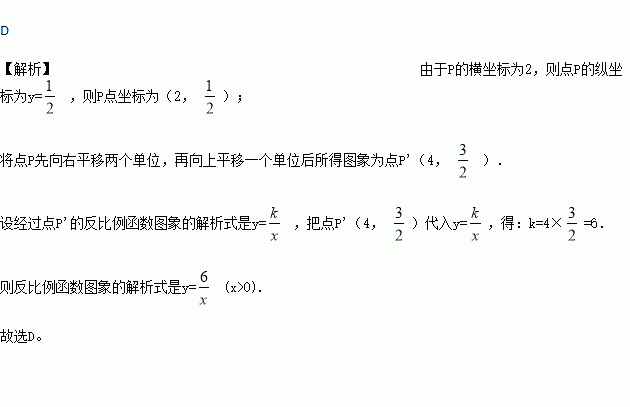 (x>0)的图象上,且横坐标为2.若将点P先向右平移两个单位,再向上平移一个单位后所得的点为点P′.则在第一象限内,经过点P′的反比例函数图象的解析式是( )