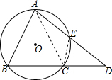 分析 连接AC,CE,由A是优弧BC的中点,得到$\widehat{AB}$=$\widehat{AC}$,根据等腰三角形的性质得到∠B=∠ACB,等量代换得到∠ACB=∠DEC,由邻补角的定义得到∠ACB+∠ACD=∠AEC+∠DEC=180°,于是得到∠AEC=∠ACD,知道△ACE∽△ADC,根据相似三角形的性质得到$\frac{AC}{AD}=\frac{AE}{AC}$,等量代换即可得到结论.