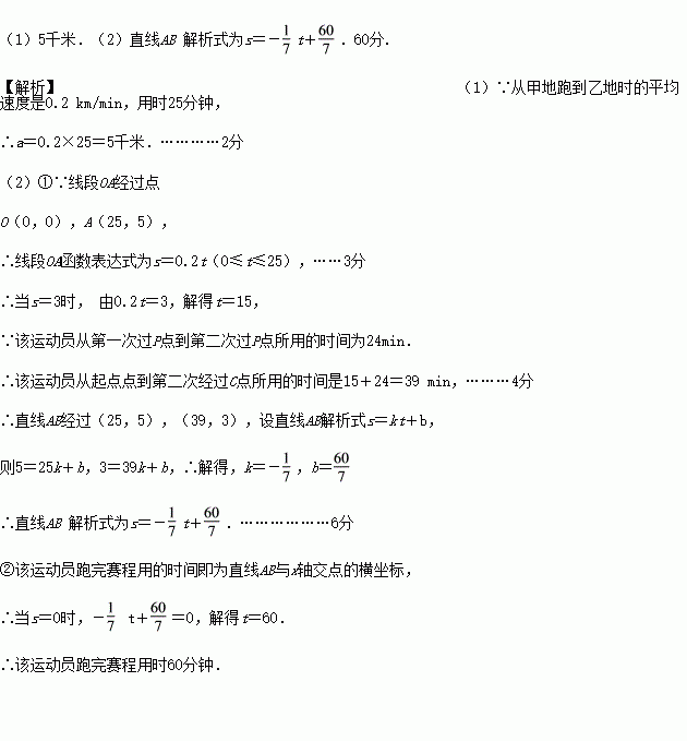 某市举行“迷你马拉松”长跑比赛,运动员从起点甲地出发,跑到乙地后,沿原路线再跑回点甲地.设该运动员离开起点甲地的路程s(km)与跑步时间t(min)之间的函数关系如图所示.已知该运动员从甲地跑到乙地时的平均速度是0.2 km/min,根据图像提供的信息,解答下列问题: