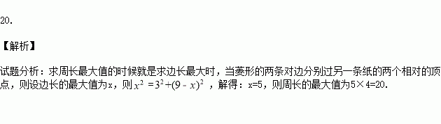 如图,将两张长为9,宽为3的矩形纸条交叉,使重叠部分是一个菱形,容易知道当两张纸条垂直时,菱形的周长有最小值12,那么菱形周长的最大值是 .
